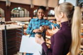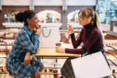 Dwie koleżanki pije kawę po zakupy. Miłośników zakupów w sklepie odzieżowym, konsumpcjonizm styl życia, moda, koleżanki w żywności sąd