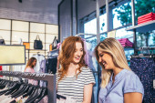 Dwie kobiety zakupów, dział bielizna. Miłośników zakupów w konsumpcjonizm styl życia, moda, sklep odzieżowy, kobiece kupujących w sekcji bielizny