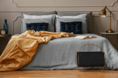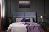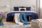 Zdjęcie "Białą poduszkę na niebieski pościel na króla łóżko w sypialni modne wnętrze" może być wykorzystywane do celów osobistych i komercyjnych zgodnie z warunkami zakupionej licencji Royalty-free. Obraz jest dostępny do pobrania w jakości wysokiej rozdzielczości do 5760x3840.
