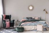Białą poduszkę na niebieski pościel na króla łóżko w sypialni modne wnętrze