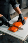 Tematu gotowanie to zawód gotowania. Zbliżenie dłoni kaukaski mężczyzna w kuchni przygotowując czerwona ryba filety łososia mięsa w czarny lateks rękawice jednolite.