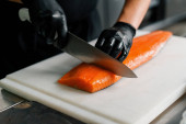 Tematu gotowanie to zawód gotowania. Zbliżenie dłoni kaukaski mężczyzna w kuchni przygotowując czerwona ryba filety łososia mięsa w czarny lateks rękawice jednolite.