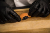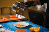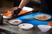 Tematu gotowanie to zawód gotowania. Zbliżenie dłoni kaukaski mężczyzna w kuchni przygotowując czerwona ryba filety łososia mięsa w czarny lateks rękawice jednolite.