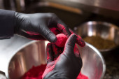 Zdjęcie "Tematu gotowanie to zawód gotowania. Zbliżenie dłoni kaukaski mężczyzna w kuchni przygotowując czerwona ryba filety łososia mięsa w czarny lateks rękawice jednolite." może być wykorzystywane do celów osobistych i komercyjnych zgodnie z warunkami zakupionej licencji Royalty-free. Obraz jest dostępny do pobrania w jakości wysokiej rozdzielczości do 5760x3840.