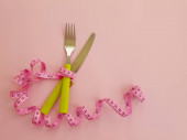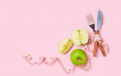 Ogryzek z miara zwijana zamiast pasa na białe płytki z tekstem moja dieta na różowym tle. Dieta, zważyć strat, głodu, koncepcja fitness.