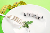 Ogryzek z miara zwijana zamiast pasa na białe płytki z tekstem moja dieta na różowym tle. Dieta, zważyć strat, głodu, koncepcja fitness.