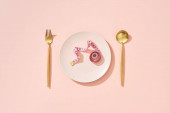 Białe płytki z łyżką, widelcem i pączek urządzone oblodzenia i kropi. Niezdrowych fast foodów. Diety, zdrowe odżywianie, styl życia. Utrata masy ciała. Otyłość. Minimalistycznym stylu, zobacz płaskie świeckich, top.