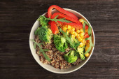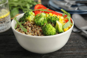 Sałatka zdrowe quinoa z warzywami w miska na białym tle