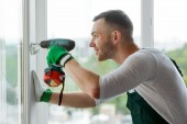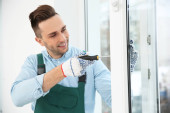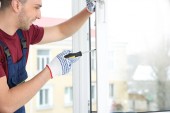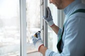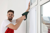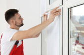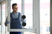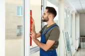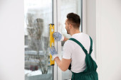 Pracownik budowlany za pomocą przyssawki podczas montażu okien w pomieszczeniu