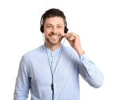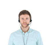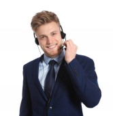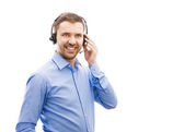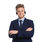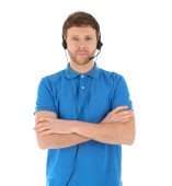 Mężczyzna pomocy technicznej operatora z zestawu słuchawkowego na białym tle