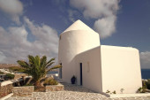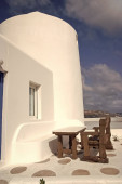 Dom w Mykonos, Grecja. Bielone, opierając się na słonecznej błękitne niebo. Typowy dom architektury i wzornictwa. Wakacje na wyspie Morza Śródziemnego. Koncepcja Wanderlust i podróży