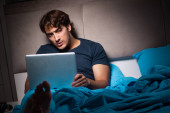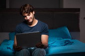 Zdjęcie "Człowiek pracuje na laptopie w nocy w łóżku" może być wykorzystywane do celów osobistych i komercyjnych zgodnie z warunkami zakupionej licencji Royalty-free. Obraz jest dostępny do pobrania w jakości wysokiej rozdzielczości do 5760x3840.