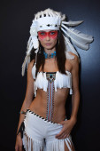 Native American Indian pióro zestaw słuchawkowy-bęben ręczny i rozmawiać trzymać się w pobliżu Naga kobieta wolność