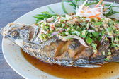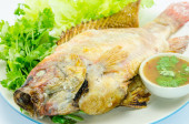 Sól-skorupą ryb z grilla i mix warzyw na talerzu, tajskie jedzenie.