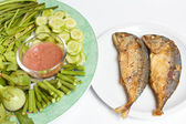 Sól-skorupą ryb z grilla i mix warzyw na talerzu, tajskie jedzenie.