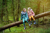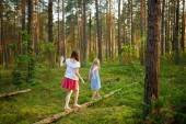 Dwa Śliczne młode siostry zabawy w lesie wycieczka na piękny letni dzień