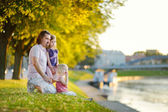 Dwa Śliczne młode siostry wędrówki w lesie nad jeziorem z ojcem w piękny letni dzień