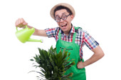 Młody rolnik z produktami świeżymi izolowanymi na białym tle