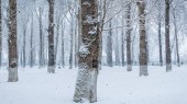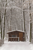 Panoramiczny widok zielony baraku, szałas, złożyć w gęstym lesie podczas opadów śniegu. Spadający śnieg zimową bajkę.
