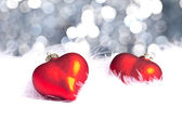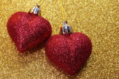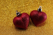 Czerwone serca z tworzywa sztucznego umieszczone na worek i drewnianym stołem.