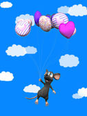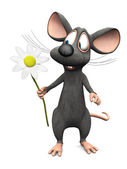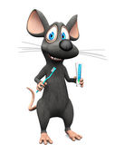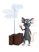 renderowania 3D uśmiechający się ładny myszy kreskówka gospodarstwa mapie. On wygląda jak on jest gotowy do podróży z dwie walizki obok niego. Jest pusta ulica znak za nim. Białe tło.