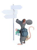 Zdjęcie "renderowania 3D uśmiechający się ładny myszy kreskówka gospodarstwa mapie. On wygląda jak on jest gotowy do podróży z dwie walizki obok niego. Jest pusta ulica znak za nim. Białe tło." może być wykorzystywane do celów osobistych i komercyjnych zgodnie z warunkami zakupionej licencji Royalty-free. Obraz jest dostępny do pobrania w jakości wysokiej rozdzielczości do 5760x3840.