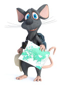 renderowania 3D kreskówka mysz trzymając mapie i wyglądające jak on myśli o czymś. Może on planuje podróż. Białe tło.