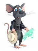 renderowania 3D kreskówka mysz trzymając podróży walizka i wyglądające jak on myśli o czymś. On wydaje się gotowy do podróży. Białe tło.