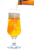 Piwo nalewa się do kieliszka z butelki na białym tle