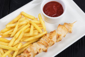 Zdjęcie "Szaszłyk z kurczaka z frytkami i ketchupem" może być wykorzystywane do celów osobistych i komercyjnych zgodnie z warunkami zakupionej licencji Royalty-free. Obraz jest dostępny do pobrania w jakości wysokiej rozdzielczości do 5760x3840.