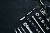 Rury, rury rammer i rury bender i frez narzędzie na monter tło pulpitu z miejsca kopii. Widok z góry zdjęcie.