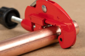 Narzędzie bender rury i rury z mosiądzu na stole w warsztacie monter tła.
