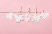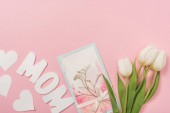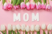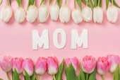 różowe i białe tulipany są ułożone w rzędach z papieru słowo mama w centrum na różowym tle