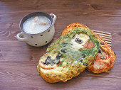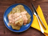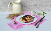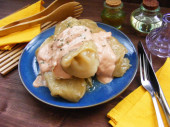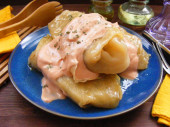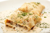 rosyjski i białoruski rustykalna kuchnia: gołąbki rolki z posiłku na podłoże drewniane