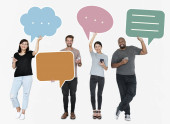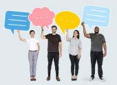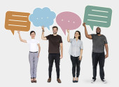 Zdjęcie "Zróżnicowane szczęśliwych ludzi trzyma mowy Bańka ikony" może być wykorzystywane do celów osobistych i komercyjnych zgodnie z warunkami zakupionej licencji Royalty-free. Obraz jest dostępny do pobrania w jakości wysokiej rozdzielczości do 5760x3840.