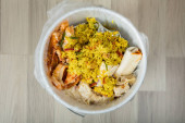 Zdjęcie "Wynos porcję Yee Sang lub Yusheng w pojemniku dla wygody. Podjęte podczas chiński nowy rok przez podrzucanie pałeczkami, uważa, że przynosi szczęście." może być wykorzystywane do celów osobistych i komercyjnych zgodnie z warunkami zakupionej licencji Royalty-free. Obraz jest dostępny do pobrania w jakości wysokiej rozdzielczości do 5760x3840.