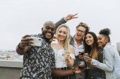 Wesoły znajomi świętować na przyjęcie urodzinowe na dachu