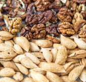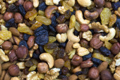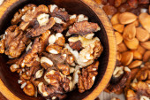 Obrane migdały, rodzynki, moreli wzór kamienia. Tekstury tła makro z różnych orzechów