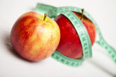 Smaczny, dojrzałe jabłka zawijane w taśmy mierniczej. Owoce na stół ciemny. Czarne tło.