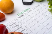 Zdjęcie "Arkusza plan diety i świeże jedzenie na białym tle. Widok z góry, pojęcie zdrowego odżywiania." może być wykorzystywane do celów osobistych i komercyjnych zgodnie z warunkami zakupionej licencji Royalty-free. Obraz jest dostępny do pobrania w jakości wysokiej rozdzielczości do 5760x3840.