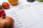 Arkusza plan diety i świeże jedzenie na białym tle. Widok z góry, pojęcie zdrowego odżywiania.