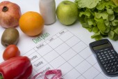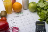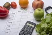 Arkusza plan diety i świeże jedzenie na białym tle. Widok z góry, pojęcie zdrowego odżywiania.