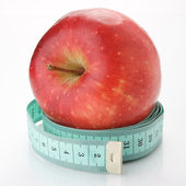Smaczny, dojrzałe jabłka zawijane w taśmy mierniczej. Owoce na stół ciemny. Czarne tło.