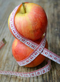 Smaczny, dojrzałe jabłka zawijane w taśmy mierniczej. Owoce na stół ciemny. Czarne tło.