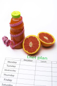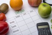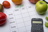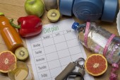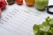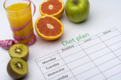 Arkusza plan diety i świeże jedzenie na białym tle. Widok z góry, pojęcie zdrowego odżywiania.