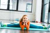 Słodkie dziecko robi Szpagat na niebieski mat w siłowni