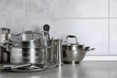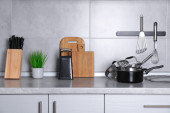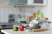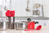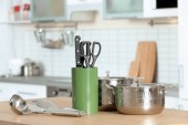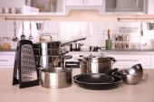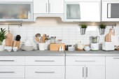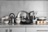 Zestaw czyste naczynia kuchenne i naczynia na stół w kuchni