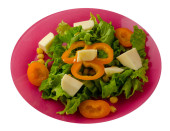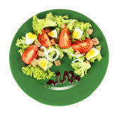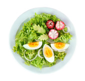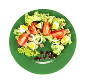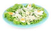 świeża sałatka z jaj, liście sałaty i inne warzywa na kolor płyty, na białym tle