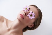 Widok z boku z eleganckiej kobiety z kwiatami na twarz tulip na beżowym tle
