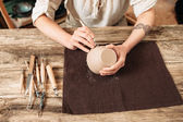 Kobieta co ceramiki i ceramiki naczynia na warsztatach, pracy z gliny z bliska
